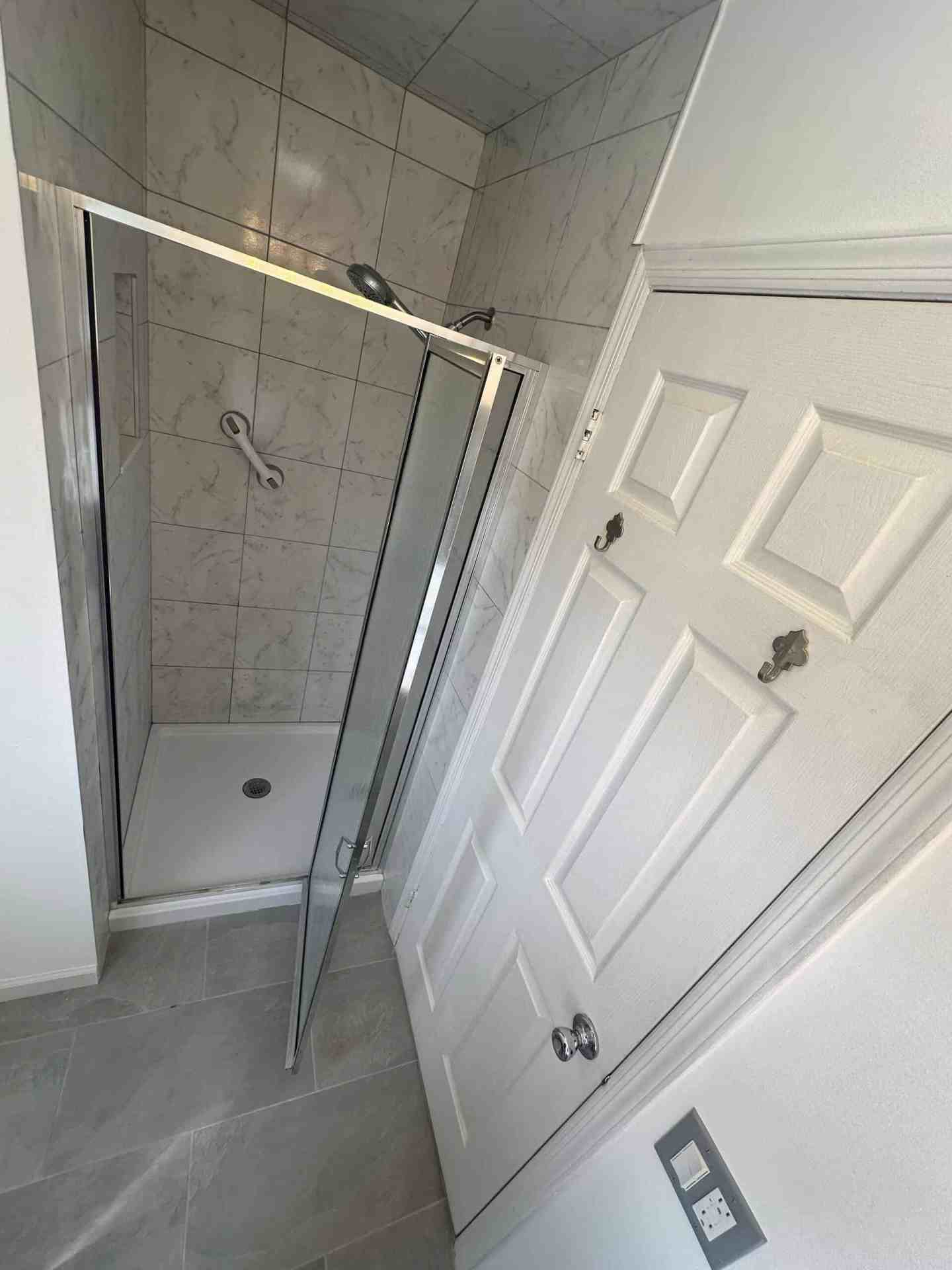 - Mirror and Shower Doors: The mirror and shower doors were also replaced to maintain the bathroom’s aesthetic and functionality. We installed new, durable shower doors and a high-quality mirror to enhance the overall appearance.